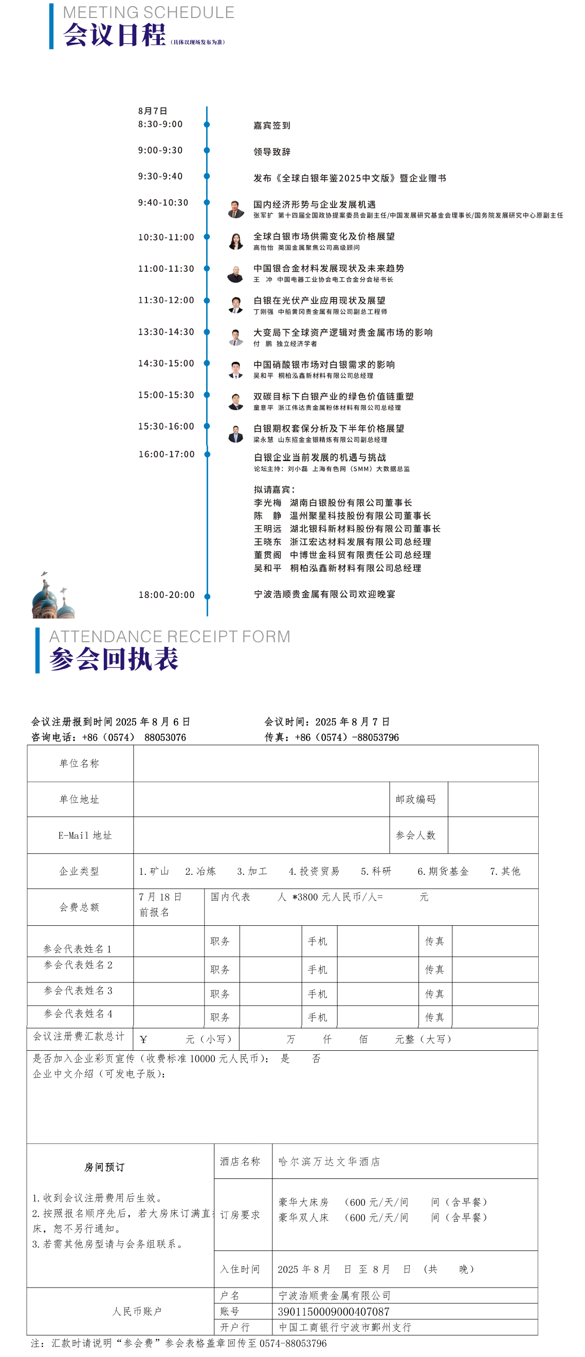 为深入学习贯彻党的二十大和二中、三中全会精神,进一步强化企业科技创新的主体作用,引导我国白银产业加强协同创新,为我国白银产业高质量发展不断塑造新动能新优势,中国黄金协会定于 2025 年8 月6 日-7 日在黑龙江省哈尔滨市举办2025(第十一届)全国白银企业年会,本届年会的主题为“聚力协同创新 共创白银未来”。现将年会有关事宜通知如下: