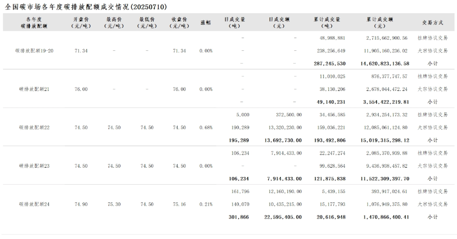 2025年1月1日至7月10日,全国碳市场碳排放配额成交量42,102,689吨,成交额3,155,009,349.11元。