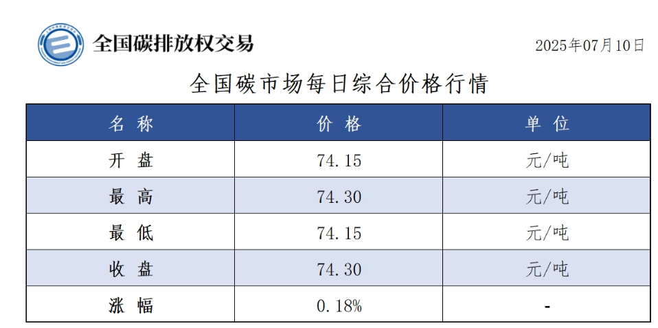 今日全国碳市场综合价格行情为: 开盘价74.15元/吨,最高价74.30元/吨,最低价74.15元/吨,收盘价74.30元/吨,收盘价较前一日上涨0.18%。
