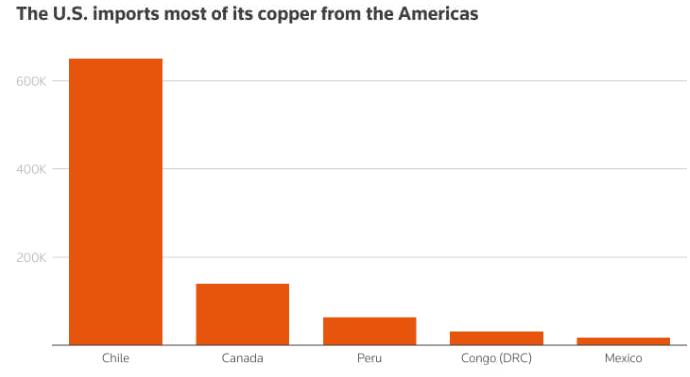 根据美国地质调查局(USGS)的数据,智利、加拿大和秘鲁去年占美国精炼铜进口量的90%以上。
