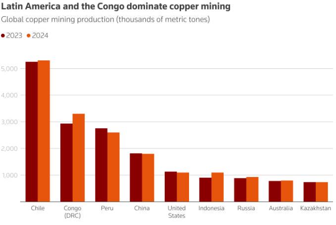 根据美国地质调查局数据,智利和秘鲁去年总共开采了大约全球三分之一的铜。刚果民主共和国目前超过秘鲁,成为全球第二大铜矿国。