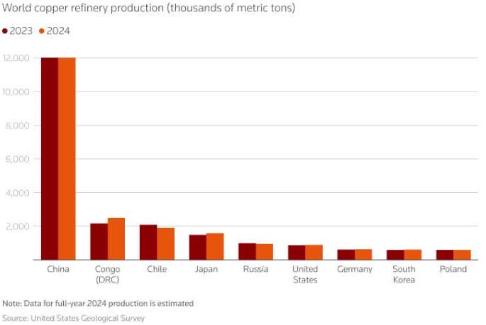 中国的铜冶炼行业令其他所有国家相形见绌。去年,中国有数十家铜冶炼厂在运营。与此同时,根据美国地质调查局的数据,美国只有两家初级铜冶炼厂。