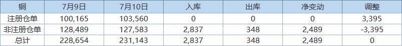 7月10日COMEX铜库存为231,143短吨,入库2,837短吨,出库348短吨,净增加2,489短吨,未作调整。