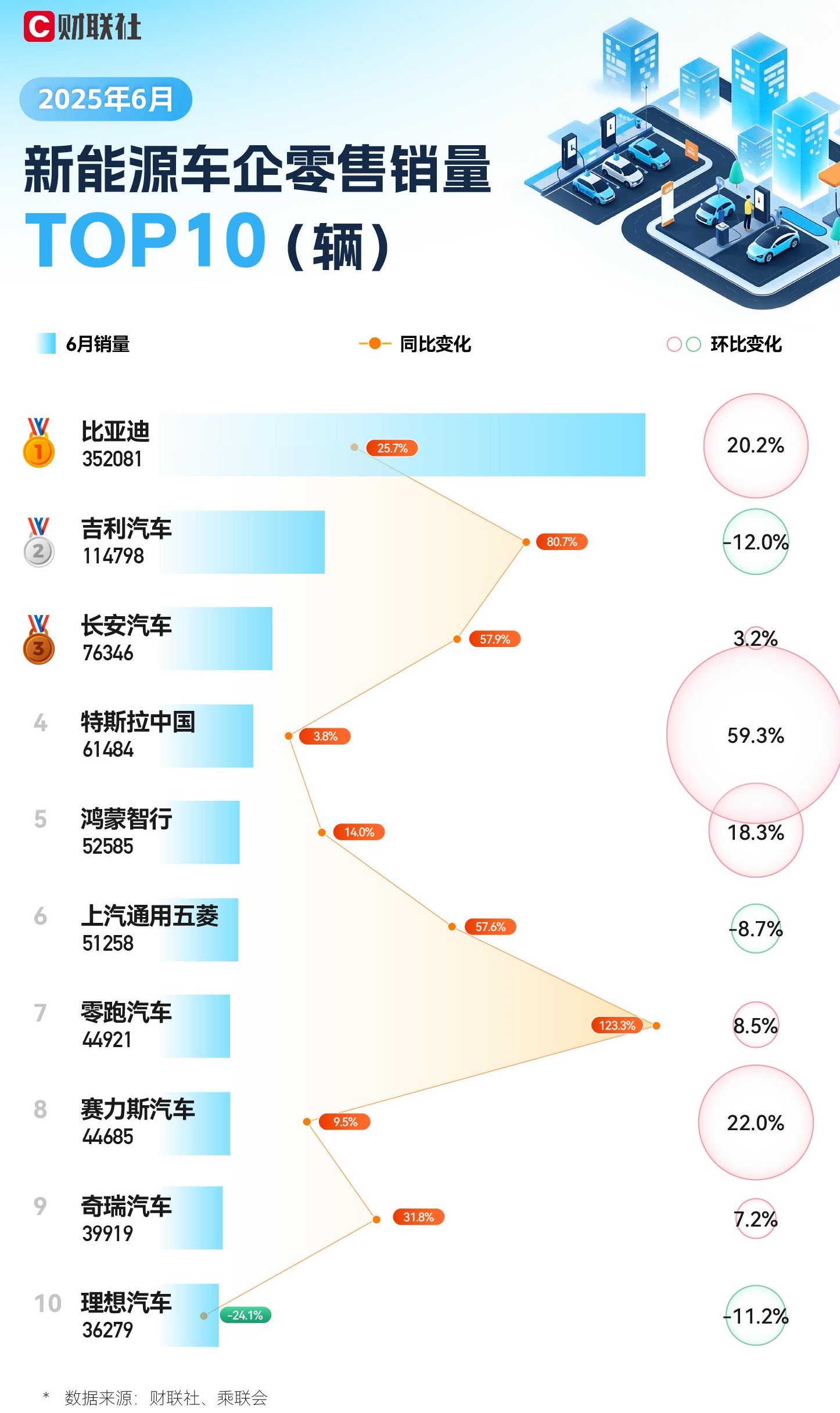 在“两新”政策及多地促消费政策持续发力的背景下,6月新能源汽车市场热度依旧不减。自主品牌与新势力车企持续发力,市场竞争格局加速重构。伴随国内新能源车企半年“成绩单”尘埃落定,6月新能源车企零售销量TOP10榜单正式公布。