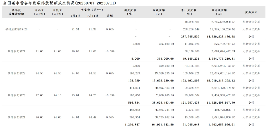 2025年1月1日至7月11日,全国碳市场碳排放配额成交量42,617,389吨,成交额3,193,250,425.61元。