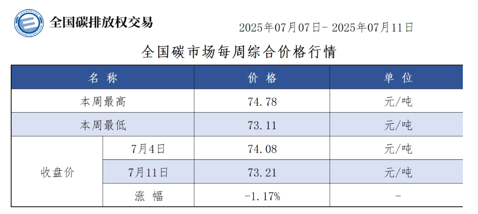 本周全国碳市场综合价格行情为:最高价74.78元/吨,最低价73.11元/吨,收盘价较上周五下跌1.17%。