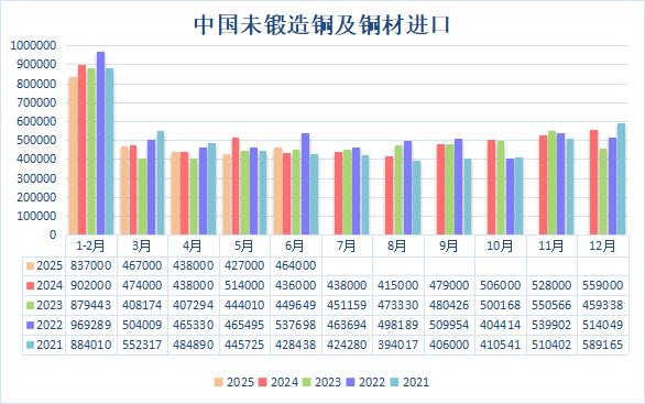 海关总署数据显示,中国2025年6月未锻轧铜及铜材进口量为46.4万吨,环比回升,且高于去年同期水平。1-6月累计进口量为263.3万吨,同比减少4.6%。6月份为铜需求淡季,不过未锻轧铜及铜材进口量回升。