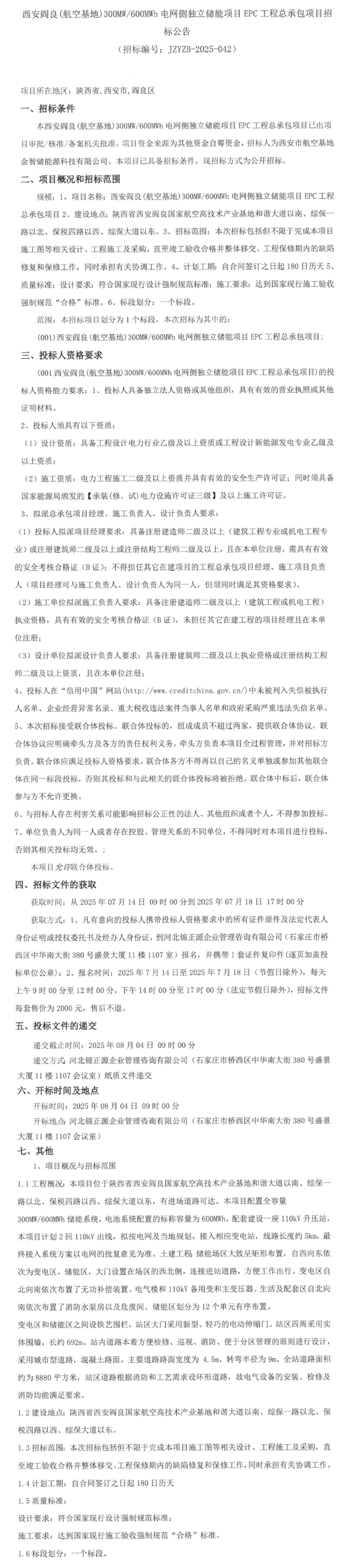 北极星储能网获悉,7月14日,西安阎良(航空基地)300MW/600MWh电网侧独立储能项目EPC工程总承包项目招标公告发布,招标人为西安市航空基地金智储能源科技有限公司。项目位于陕西省西安阎良国家航空高技术产业基地和谐大道以南、综保一路以北、保税四路以西、综保大道以东。