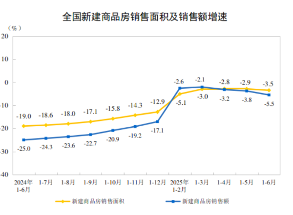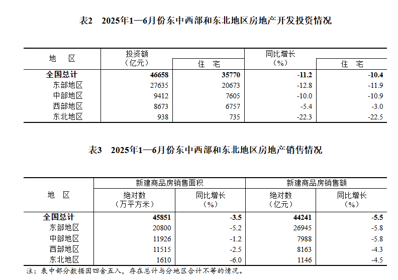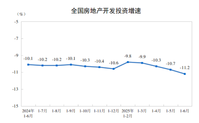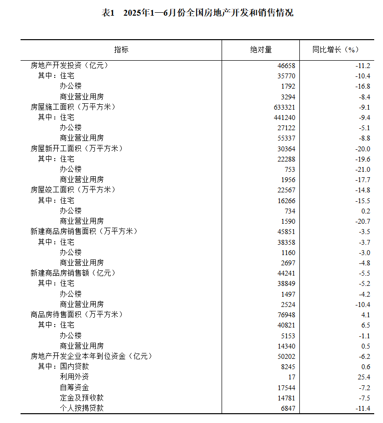 国家统计局数据显示,1—6月份,全国房地产开发投资46658亿元,同比下降11.2%;其中,住宅投资35770亿元,下降10.4%。1—6月份,新建商品房销售面积45851万平方米,同比下降3.5%;其中住宅销售面积下降3.7%。