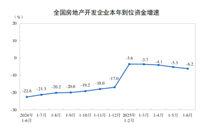 1—6月份,房地产开发企业到位资金50202亿元,同比下降6.2%。其中,国内贷款8245亿元,增长0.6%;利用外资17亿元,增长25.4%;自筹资金17544亿元,下降7.2%;定金及预收款14781亿元,下降7.5%;个人按揭贷款6847亿元,下降11.4%。