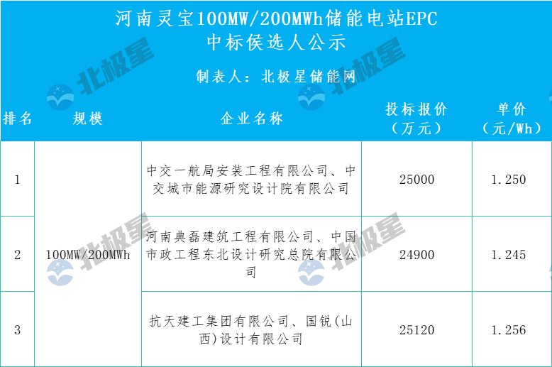 第一中标候选人为中交一航局安装工程有限公司、中交城市能源研究设计院有限公司联合体,投标报价25000万元,折合单价1.250元/Wh;