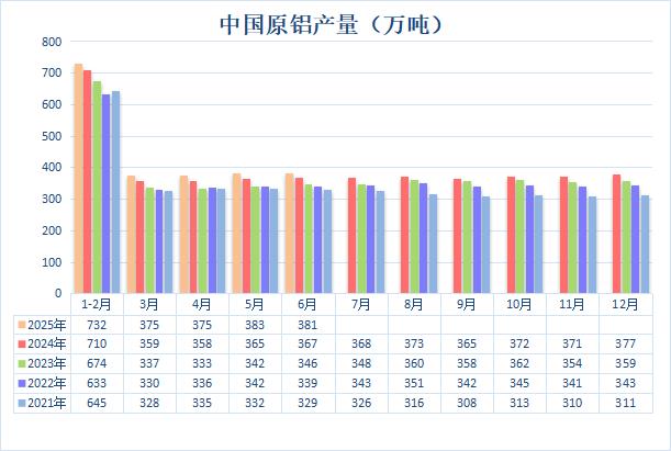 国家统计局发布报告显示,中国2025年6月原铝(电解铝)产量为381万吨,同比增长3.4%。6月国内电解铝运行产能环比微浮变动,因山东-云南的电解铝二期置换开始,此次要求原厂置换产能减产并验收合格后再起槽新厂,电解铝产量环比微降。进入7月份,SMM表示,国内电解铝运行产能维持高位运行,云南第二批置换项目投产运行,行业开工率回升,其他项目暂无动静。