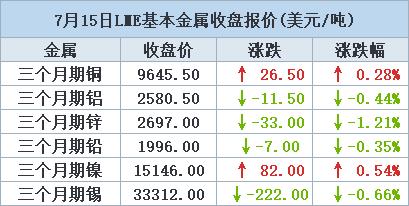 伦敦时间7月15日17:00(北京时间7月16日00:00),LME三个月期铜收盘上涨26.50美元,或0.28%,报每吨9,645.50美元。铜价本月迄今已下跌逾2%,已从7月初创下的三个月高点每吨10,020美元回落。