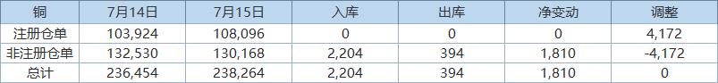 7月15日COMEX铜库存为238,264短吨,入库2,204短吨,出库394短吨,净增加1,810短吨,未作调整。