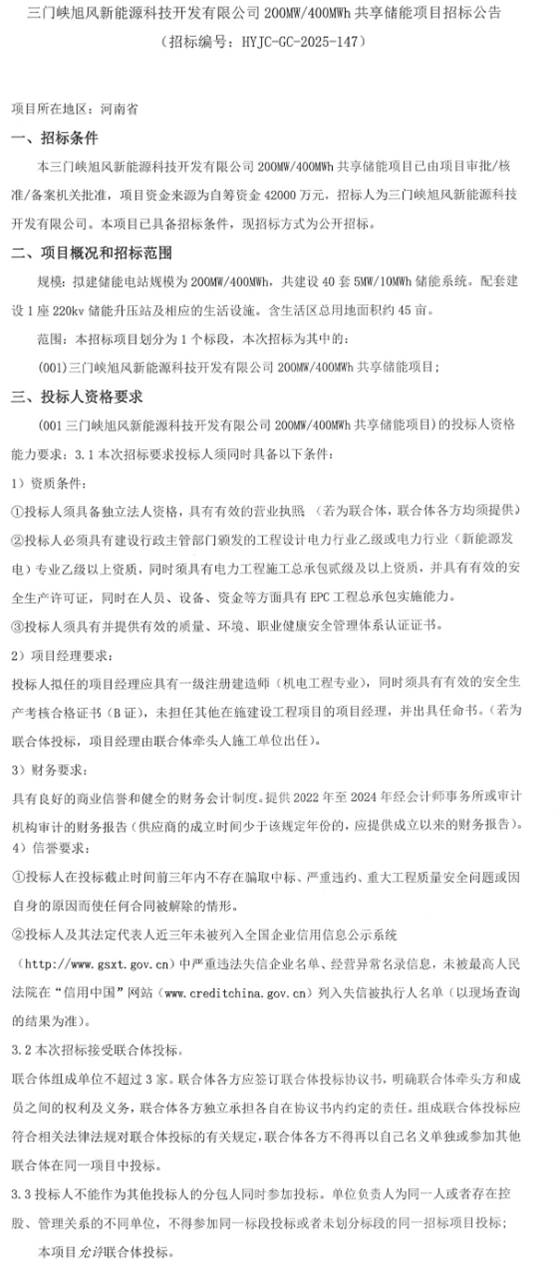 北极星储能网讯:7月15日,河南三门峡旭风新能源科技开发有限公司200MW/400MWh共享储能项目招标公告发布,项目资金来源为自筹资金42000万元,折合单价1.05元/Wh。招标人为三门峡旭风新能源科技开发有限公司,为东旭蓝天新能源股份有限公司旗下公司。