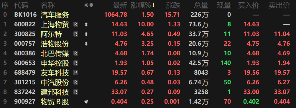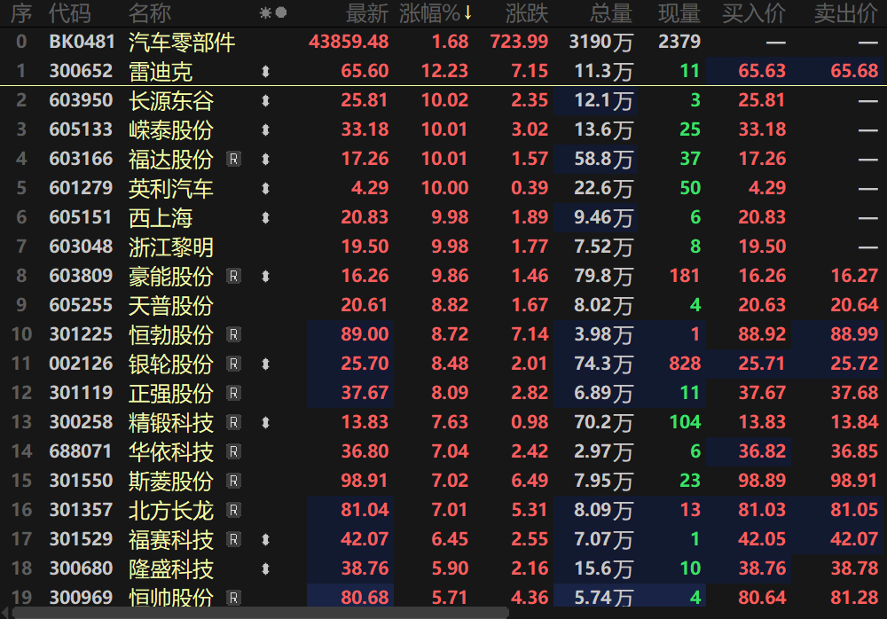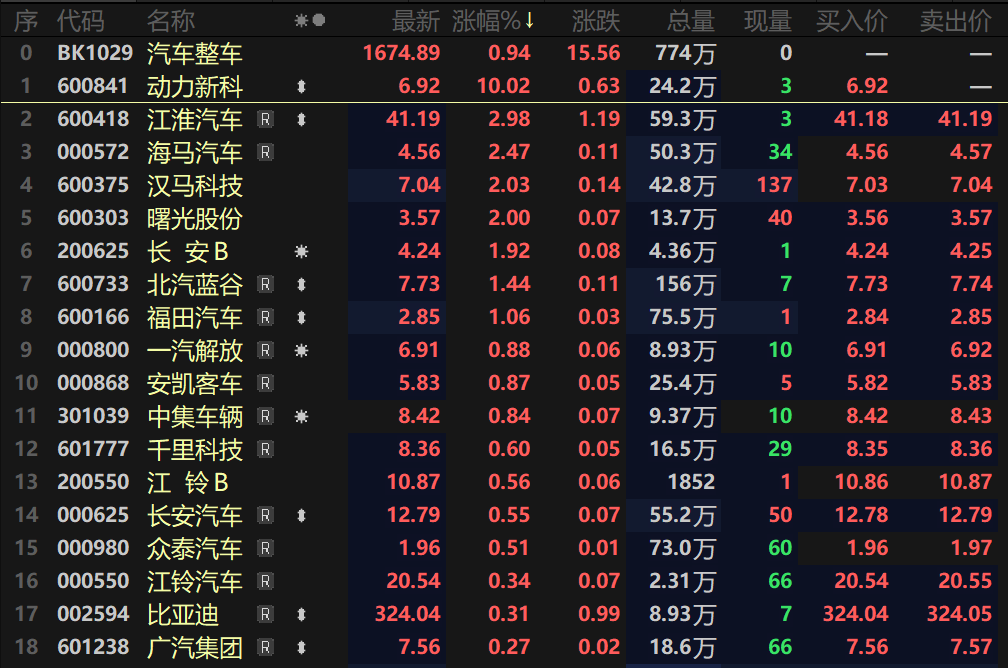 在汽车零部件冲高的同时,汽车服务、汽车整车指数盘中一同冲高,盘中涨幅均超1%。
