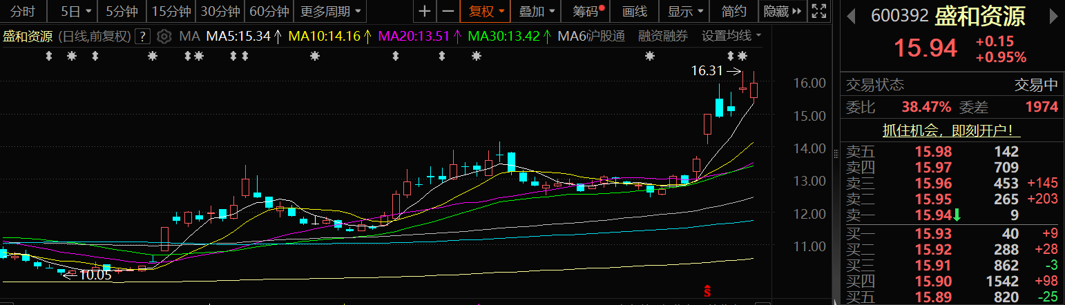 盛和资源7月17日股价出现上涨,截至17日14:16分,盛和资源涨0.95%,报15.94元/股。