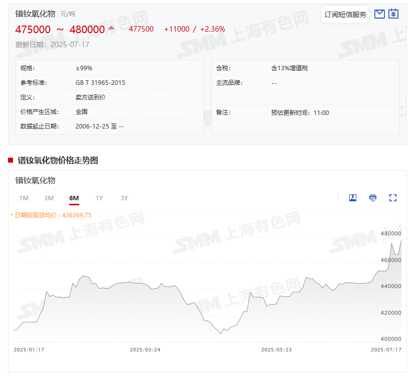 进入7月以来,稀土价格整体处于上涨态势,据SMM最新报价显示,7月17日,氧化镨钕价格涨至475000~480000元/吨,其均价为477500元/吨,较前一交易日上涨2.36%,涨幅明显。据悉,目前,稀土市场价格尤其是轻稀土价格出现明显上涨。北方稀土7月17日竞价销售结果为报警价全部成交。随着竞价价格持续上涨,多数业者对下游需求预期看好,市场信心得到提振,进一步拉动现货市场报价上调。随着传统淡季接近尾声,终端需求有好转预期,下游磁材企业对高价金属接受度逐渐提高,为稀土价格提供支撑。整体来看,集团竞拍的高热度提振市场信心,叠加终端需求逐渐好转,为价格提供需求支持,带动市场价格上涨。预计短期内,稀土价格受市场信心提振影响或将继续偏强稳运行。
