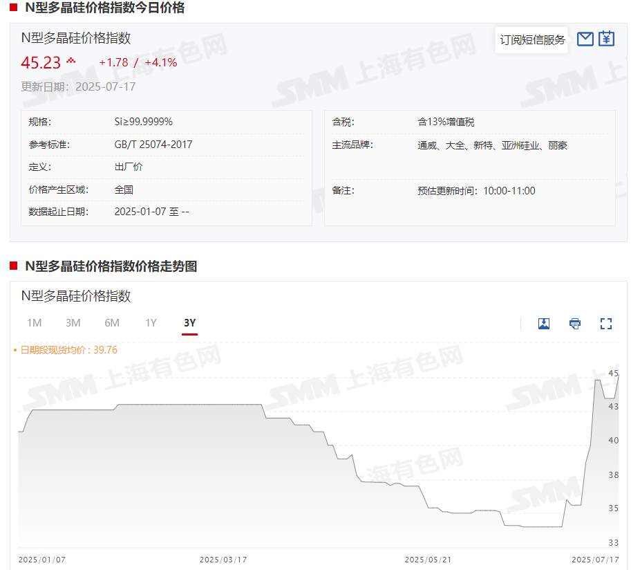 现货价格方面,截至7月17日,N型多晶硅现货报价涨至45.23元/千克,较其此前的低点34元/千克,总计上涨11.23元/千克,涨幅达33.03%。