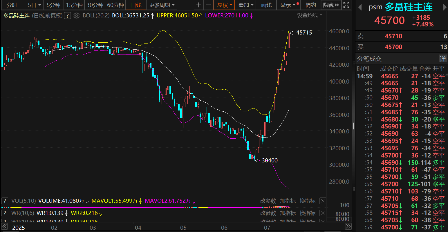 SMM 7月17日讯:12连涨!自7月2日以来,多晶硅期货价格在行业自律和“反内卷”的重拳出击下迎来“惊天反转”,继于7月2日和7月8日短短五个交易日的时间迎来两连板战绩之后,7月17日,多晶硅主连盘中再度拉涨超7%,盘中最高上涨至45715元/吨的高位,刷新其上市以来的历史新高!距离其6月25日的低点30400元/吨上涨15315元/吨,涨幅高达50.38%。