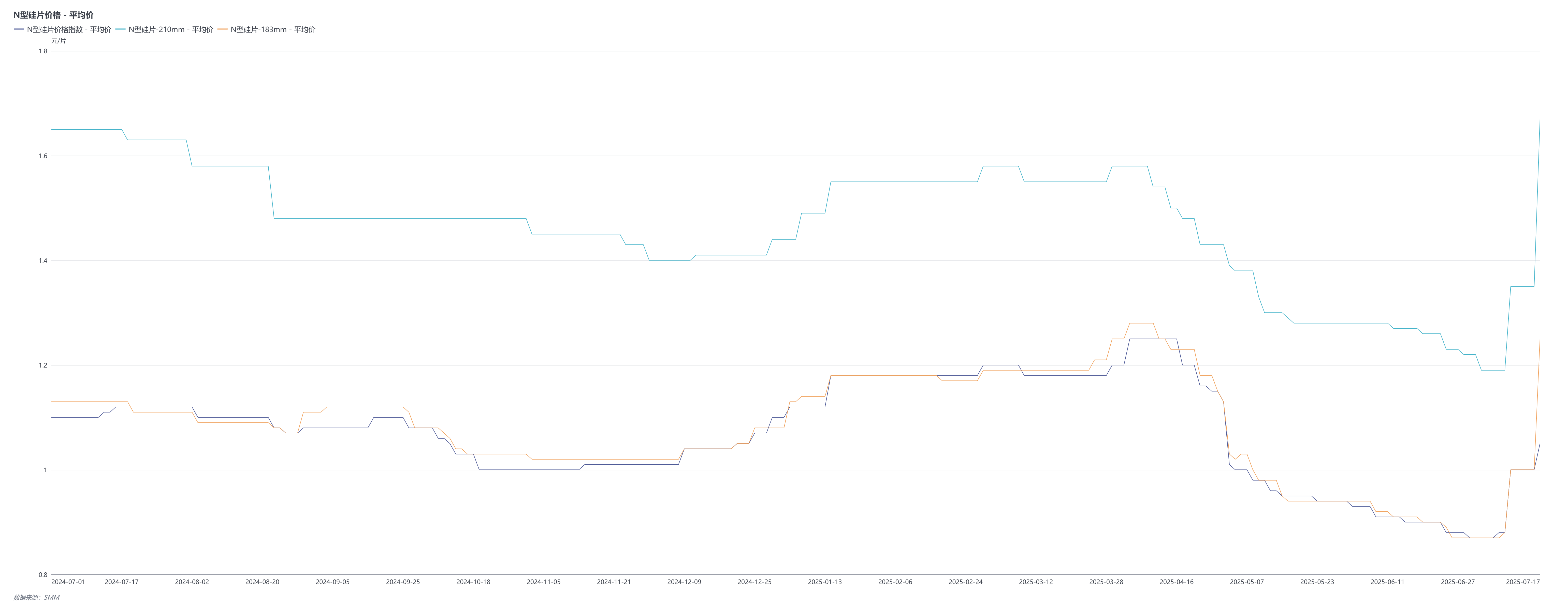 据SMM现货报价显示,本周N型硅片-183mm现货报价在7月17日涨至1.05~1.45元/片,均价报1.25元/片,较7月10日涨幅高达25%,N型硅片-210mm在7月17日涨至1.4~1.93元/片,均价报1.67元/片,涨幅高达23.33%;N型硅片-210R现货报价在7月17日上涨至1.2~1.65元/片,均价报1.43元/片,较7月10日涨幅高达23.91%。