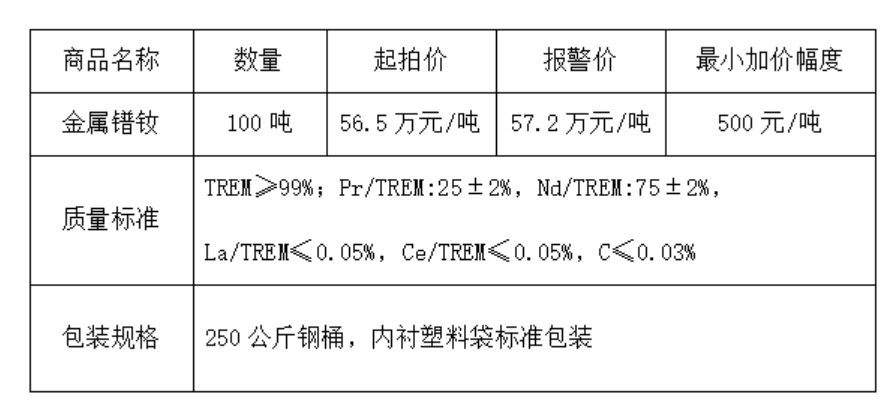 其中:商品名称为金属镨钕,数量为100吨,该商品起拍价为56.5万元/吨,该价格为含税价格,报警价为本次交易标的的最高价。交易商每次报价需以500元/吨的整数倍进行递增报价,最大加价幅度不超过1000元/吨。买卖双方履约保证金比例为货物总价的20%。专场竞价收取交易手续费,手续费标准详见官网公告。