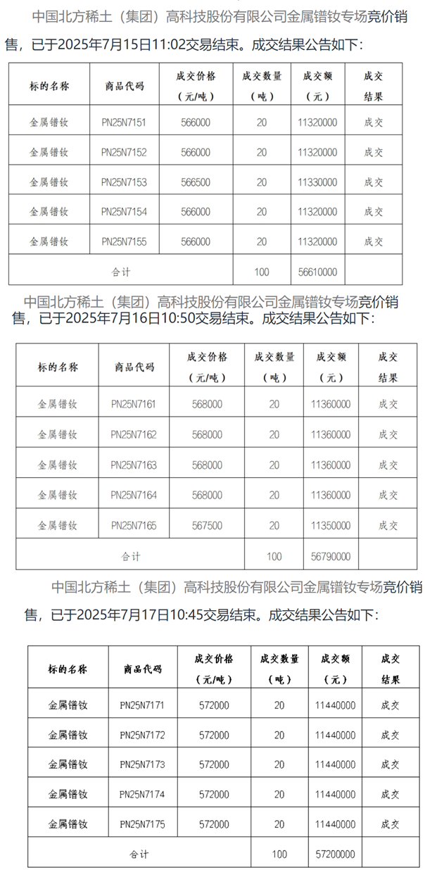 从北方稀土金属镨钕7月15日-7月17日的竞价销售成交结果来看:其7月15日的成交价格分别为56.6万元/吨(高于起拍价0.1万元/吨)成交了80万吨、56.65万元/吨(高于起拍价0.15万元/吨)成交了20万吨,100吨的金属镨钕于7月15日的11:02交易结束;其7月16日的成交价格分别为56.8万元/吨(高于起拍价0.3万元/吨)成交了80吨、56.75万元/吨(高于起拍价0.25万元/吨)成交了20吨,100吨的金属镨钕于7月16日的10:50交易结束;其7月17日的成交价格均为57.2万元/吨(高于起拍价0.7万元/吨,且触及本次交易的报警价即标的最高价),100吨的金属镨钕于7月17日的10:45交易结束。