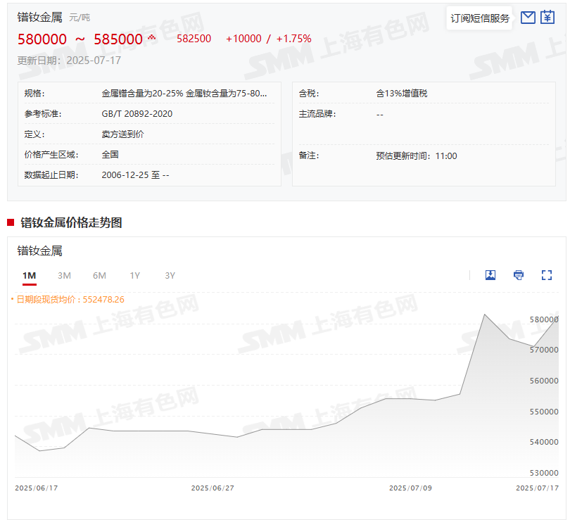 随着竞标价格持续上行,多数业者对下游需求预期向好,市场信心得以提振,进一步拉动现货市场报价走高。据 SMM 报价,7 月 17 日氧化镨钕价格涨至 47.5 万~48 万元 / 吨,均价 47.75 万元 / 吨,较前一交易日上涨 2.36%;金属镨钕报价 58 万~58.5 万元 / 吨,均价 58.25 万元 / 吨,较前一交易日上涨 1 万元 / 吨,涨幅 1.75%。