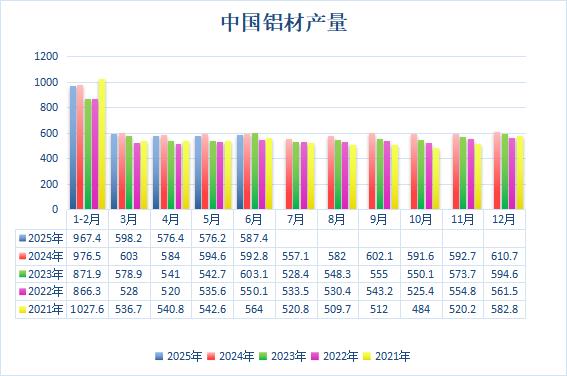 国家统计局发布报告显示,中国2025年6月中国铝材产量为587.4万吨,环比出现回升,同比微增0.7%。1-6月中国铝材产量为3276.8万吨,同比增加1.3%。受出口退税政策取消的影响,今年上半年国内铝材出口量同比下滑。内需方面,建筑型铝材受地产行业拖累,不过光伏、新能源汽车等方面需求显著增长、