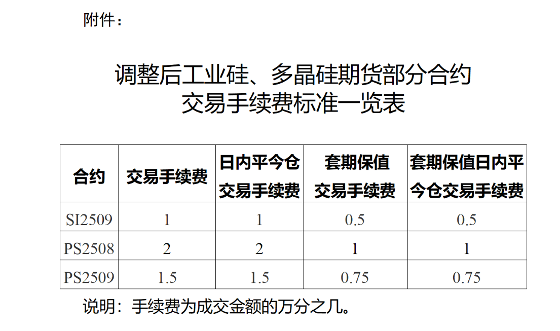 多晶硅期货PS2508合约的交易手续费标准调整为成交金额的万分之二,日内平今仓交易手续费标准调整为成交金额的万分之二。多晶硅期货PS2509合约的交易手续费标准调整为成交金额的万分之一点五,日内平今仓交易手续费标准调整为成交金额的万分之一点五。