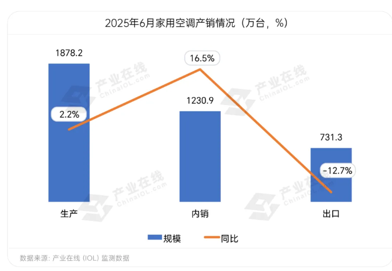 产业在线监测数据显示,2025年6月中国家用空调生产1878.2万台,同比增长2.2%;销售1962.2万台,同比增长3.6%。其中内销规模1230.9万台,同比增长16.5%;出口规模731.3万台,同比下降12.7%。