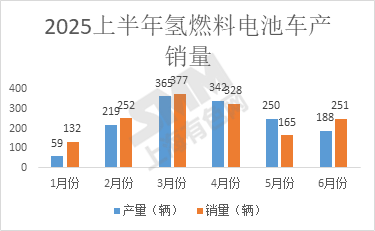 中国汽车工业协会(CAAM)发布的 6 月数据显示,氢燃料电池汽车产量为 188 辆,环比下降24.8%;销量为 251 辆,环比增加52.1%。其中6月份产量占2025上半年产量13.2%,销量占上半年16.7%。