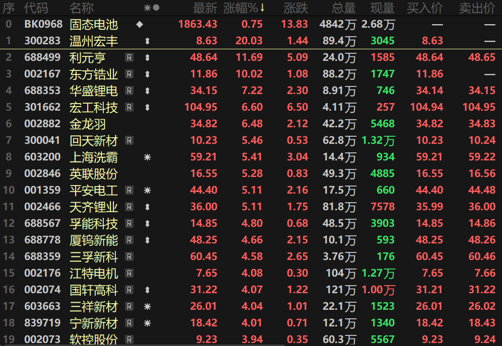 固态电池板块盘中一同走高,温州宏丰盘中20CM涨停,东方锆业、平安电工盘中一同封死涨停板。孚能科技、宏工科技、诺德股份等一同跟涨。