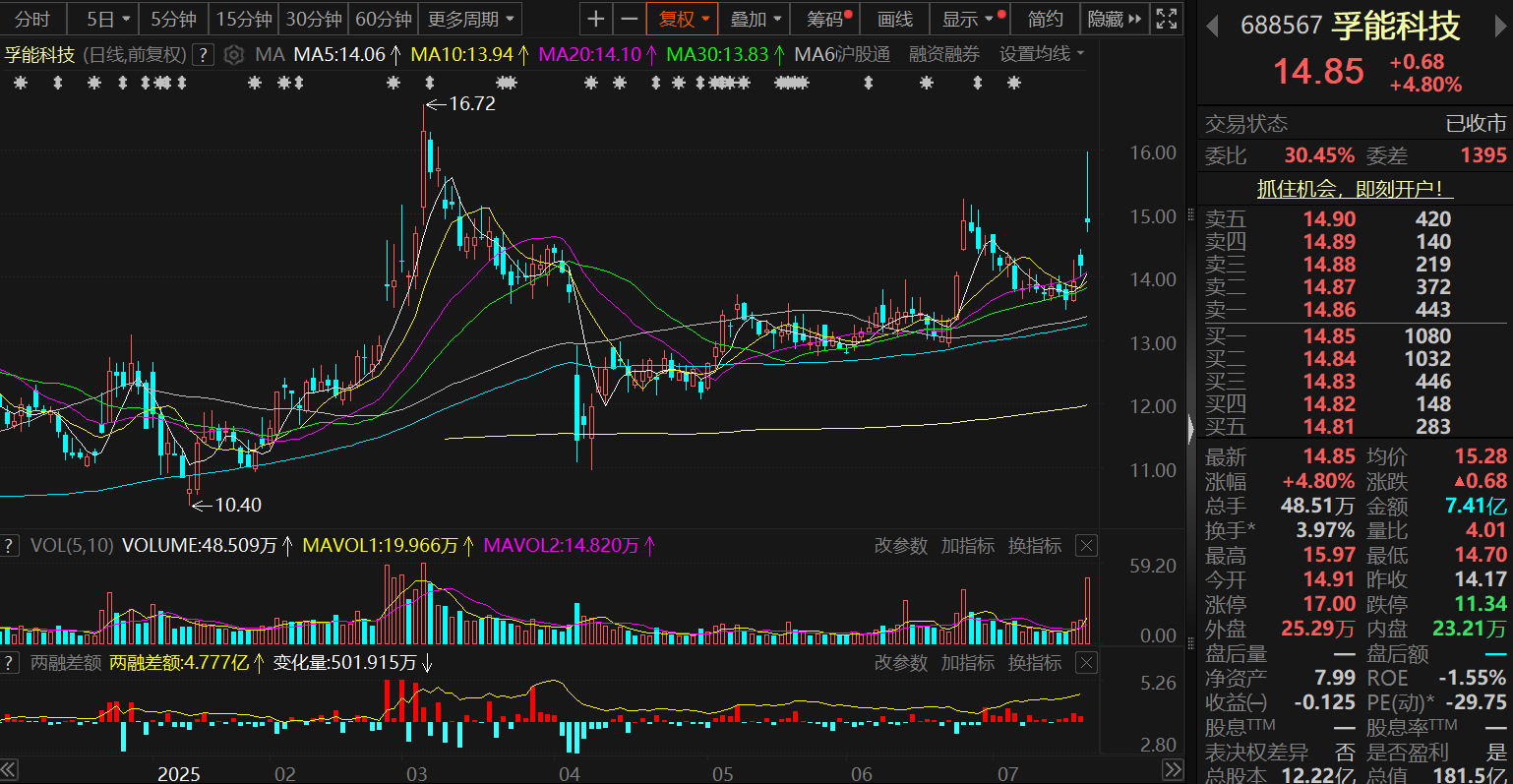 而受此利好消息刺激,孚能科技今日跳空高开,盘中涨幅一度高达19.9%,但随后回落至7%左右。