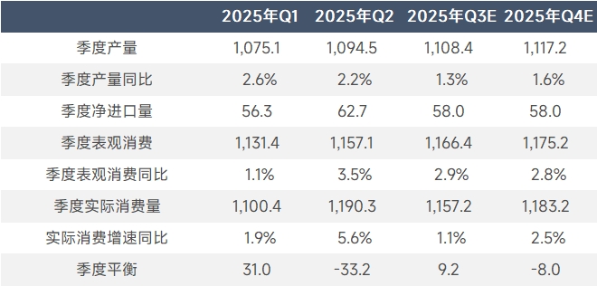 进入2025年下半年,海外宏观扰动风险仍存,中美贸易战的后续仍需追踪,对于美联储降息预期的关注又起;国内宏观利好、促进消费的氛围不变,“反内卷”或造成短期终端需求波动。基本面,供应端下半年供应端预计持稳运行,国内暂无新增项目投产预期,而除了山东-云南的置换项目外,河南-内蒙产能置换项目预计Q4陆续起槽,考虑项目置换对电解铝产量影响较小,下半年预计产量同比增速在0.9%,预计全年产量增速在1.9%左右。净进口方面,目前进口窗口仍处于关闭状态,进口货源多执行长单为主,后续随着国内旺季到来叠加海外需求疲弱影响,净进口小幅增加,预计全年净进口增速在17%左右。需求端,目前下游需求疲弱依旧,考虑25H1光伏抢装与铝材抢出口带来的需求前置影响,下半年实际消费增速较上半年的3.9%回落至2.7%左右。此外,值得注意的时,目前国内淡季,铝棒等合金产品企业亏本减产,铸锭量增多,但随着“金九银十”的到来,叠加新增合金产能投产,铝水比例将再度升高,对铝价形成较好支撑。