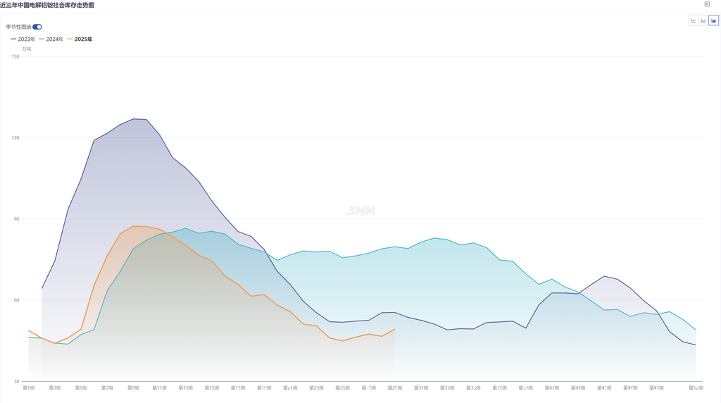 5月中至6月初,国内铝锭库存超预期去化,库存水平不断刷新二季度新低,并一度跌破45万吨关口。尽管铝价高位运行抑制下游补库意愿,且市场预期淡季临近将减缓去库,但实际去库趋势延续至6月底,铝需求韧性超出预期。去库核心驱动在于供应端持续偏紧,北方多地铝厂和西南部分电解铝厂快速提升铝水比例,而铸锭量环比下降,叠加主流消费地在途及实际到货量持续偏低,流通货源紧张的背景下,铝锭社库超预计,有利支撑铝价淡季走强。