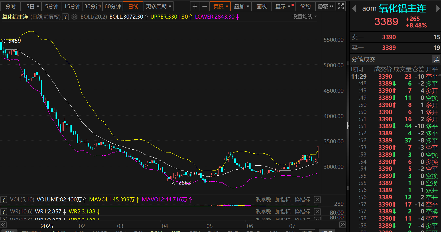 SMM 7月21日讯:7月21日早间开盘,在宏观利好消息的刺激下,氧化铝期货主连延续了7月18日晚间大幅拉涨的态势,涨幅一度超过8%。截至午间收盘,氧化铝主连以8.48%的涨幅报3389元/吨,盘中最高冲至3400元/吨,刷新2月26日以来的新高。