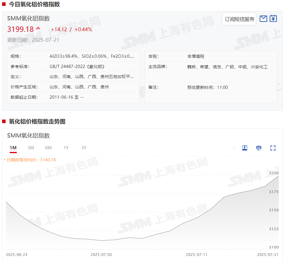 现货价格方面,截至7月21日,SMM氧化铝指数单日上涨14.12元/吨,报3199.18元/吨,较7月2日3111.78元/吨的价格上涨87.4元/吨,涨幅达2.81%。
