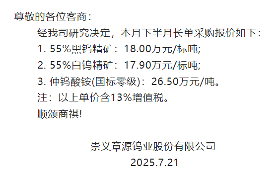 据崇义章源钨业7月21日消息:崇义章源钨业股份有限公司7月下半月长单采购报价如下:1. 55%黑钨精矿:18万元/标吨,较上轮报价上调0.8万元/标吨;2. 55%白钨精矿:17.9万元/标吨,较上轮报价上调0.8万元/标吨;3. 仲钨酸铵(国标零级):26.5万元/吨,较上轮报价上调1.25万元/吨。