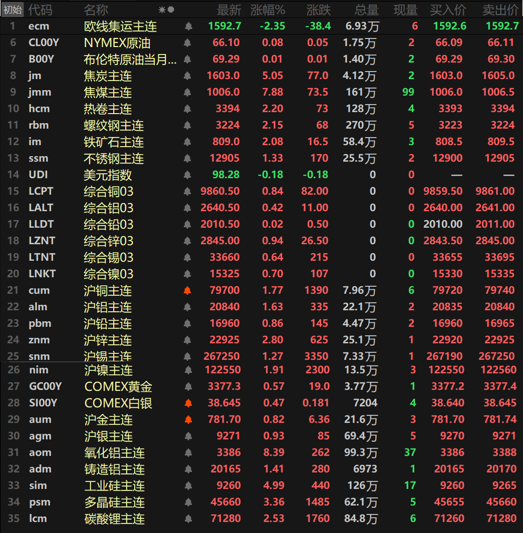 此外,碳酸锂主连涨2.53%,工业硅主连涨4.99%,多晶硅主连涨3.36%。欧线集运主连跌2.35%报1597.7。