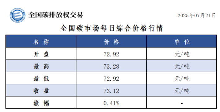 今日全国碳市场综合价格行情为: 开盘价72.92元/吨,最高价73.28元/吨,最低价72.92元/吨,收盘价73.12元/吨,收盘价较前一日上涨0.41%。