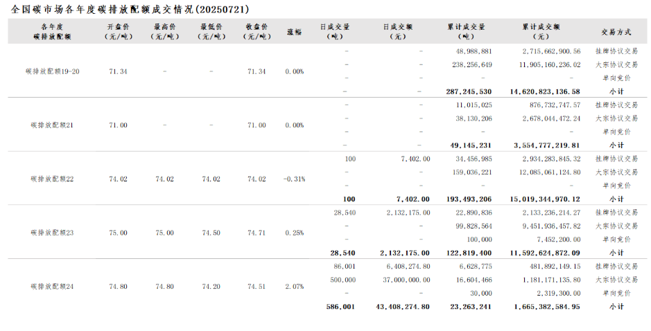 2025年1月1日至7月21日,全国碳市场碳排放配额成交量45,697,944吨,成交额3,420,225,680.04元。