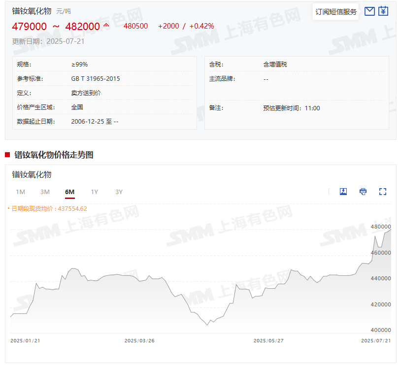 7月21日,稀土市场价格小幅上涨,具体表现为:氧化镨钕价格上调至47.9-48.2万元/吨,较前一交易日上涨0.42%;镨钕金属价格上调至58.5-59万元/吨,较前一交易日上涨1.03%。目前,稀土市场尤其是轻稀土的价格出现小幅上涨,氧化物市场:受矿端消息面刺激,叠加部分业者对后市预期较高,持货商低价出货意愿低、挺价心态浓厚,推动价格上涨;金属市场:虽成交表现不佳,但在氧化物成本支撑下,报价被迫上调;而下游磁材企业对高价金属接受度低,导致市场成交僵持,观望情绪浓厚。综合而言,当前稀土市场价格虽小幅上调,但实际成交遇阻,整体观望氛围较重。预计短期内,稀土市场价格将呈震荡运行态势。