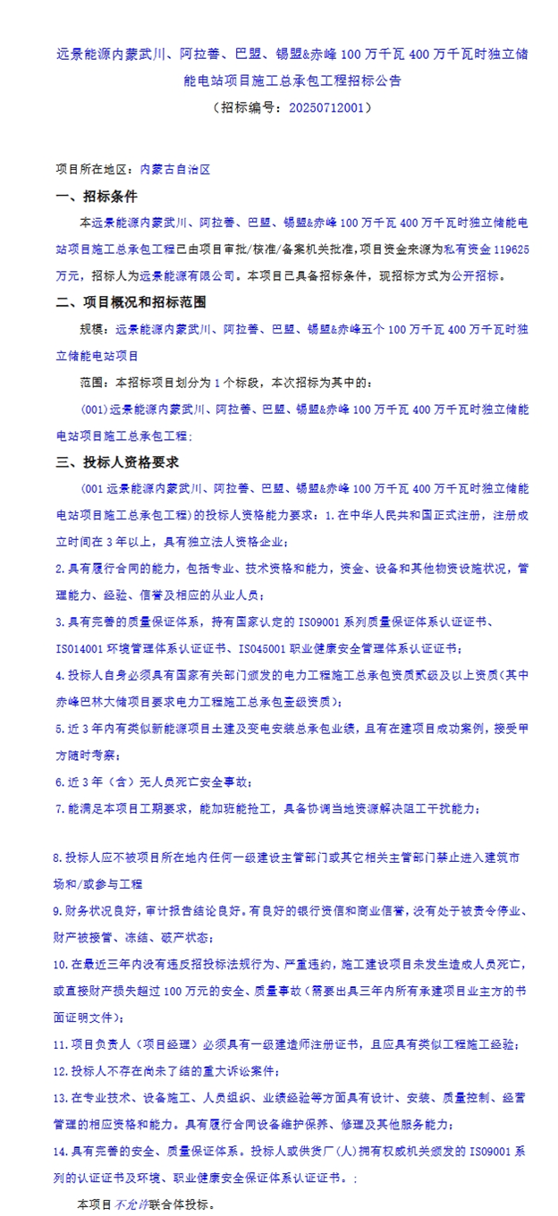 7月17日,远景能源内蒙武川、阿拉善、巴盟、锡盟&赤峰100万千瓦400万千瓦时独立储能电站项目施工总承包工程招标公告发布。