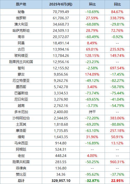 以下为根据中国海关总署官网数据整理的2025年6月锌矿砂及其精矿进口分项数据一览表:
