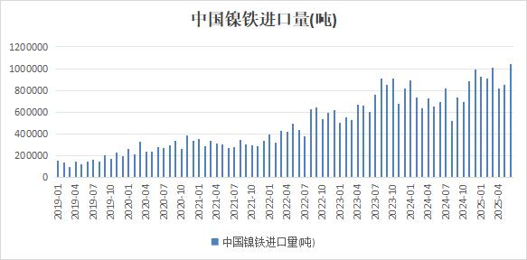 据中国海关数据统计,2025年6月中国镍铁进口量104.1万吨,环比增加19.3万吨,增幅22.8%;同比增加34.7万吨,增幅50.0%。其中,6月中国自印尼进口镍铁量101.8万吨,环比增加19.1万吨,增幅23.2%;同比增加35.7万吨,增幅53.9%。