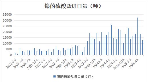 2025年1-6月中国镍的硫酸盐进口总量112961.509吨,同比增加0.08%。