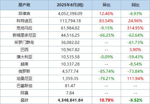 以下为根据中国海关总署官网数据整理的2025年6月镍矿砂及其精矿进口分项数据一览表: