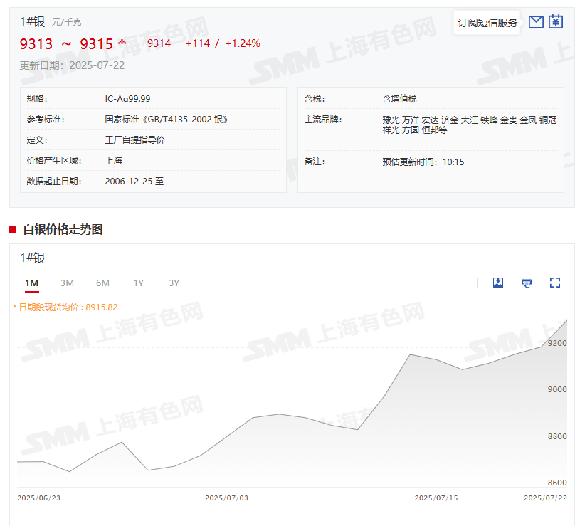 7月22日,SMM1#白银上午出厂参考均价为9314元/千克,均价较前一交易日上涨114元/千克,涨幅为1.24%。随着银价的持续上涨,现货市场交投清淡,市场观望情绪浓厚。