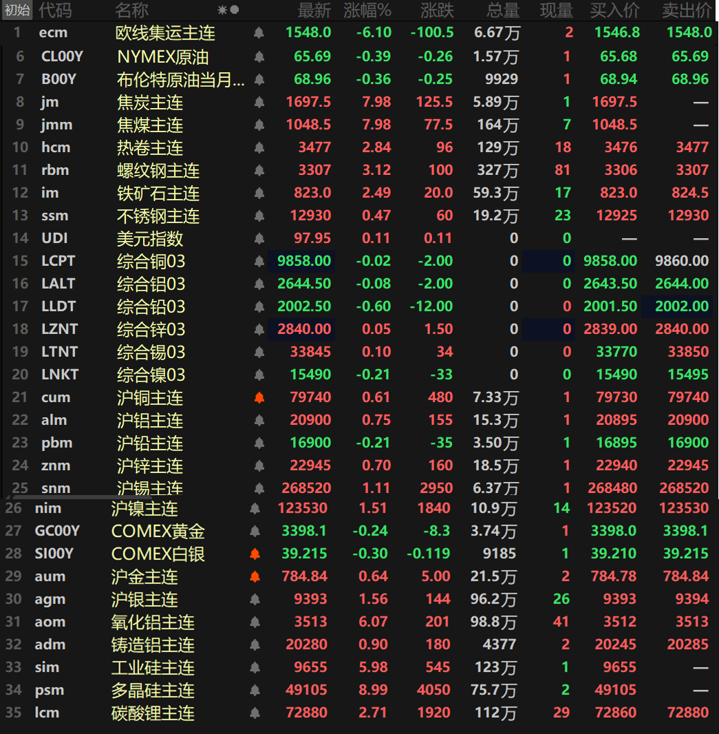 此外,碳酸锂主连涨2.71%,工业硅主连涨5.98%涨停,报9655元/吨,多晶硅主连也以8.99%的涨幅封死涨停板,报49105元/吨,刷新其上市以来的历史新高。欧线集运主连跌6.1%报1548。